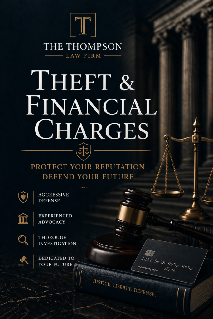 Theft and financial crime allegations can have serious, lasting consequences. Beyond potential fines and jail time, these charges can damage your reputation, career, and future opportunities. At The Thompson Law Firm, we provide strategic, aggressive defense for individuals facing theft and financial-related charges—working to protect your rights and minimize the impact on your life.