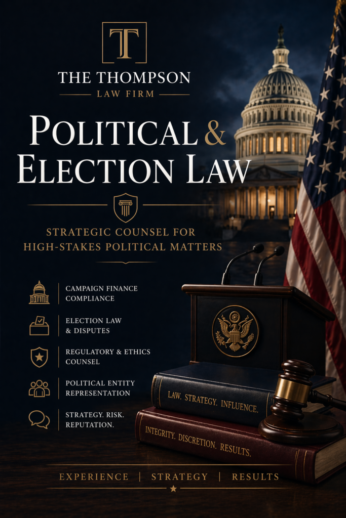 Political and election-related matters demand precision, discretion, and a deep understanding of complex laws and regulations. At The Thompson Law Firm, we provide strategic legal counsel to candidates, campaigns, organizations, and individuals involved in political and election law matters.